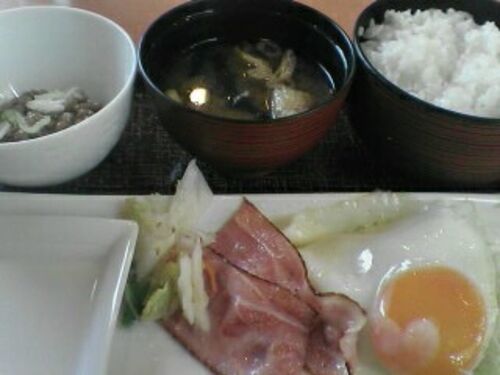 ベーコンエッグ朝食Mセット¥600 +納豆¥100 ご飯大盛¥50 /¥750 デニーズカード割引-¥37 /¥713