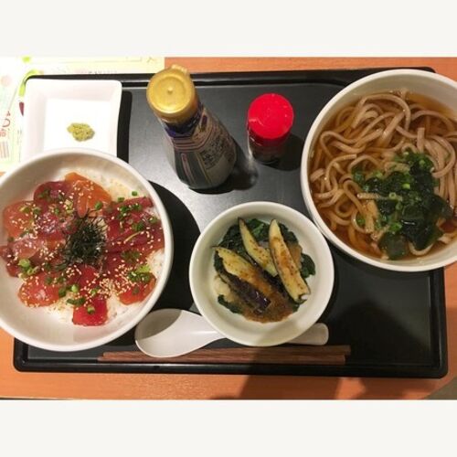 天然まぐろの漬け丼と七穀うどん(選べる小鉢つき) 1,449円(税込1,593円) 小鉢は「茄子とほうれん草のおろし和え」にしました。 at デニーズ_北池袋店 来店まで寒い中、歩いて身体が冷えてしまったので、温まるうどんを食べた。