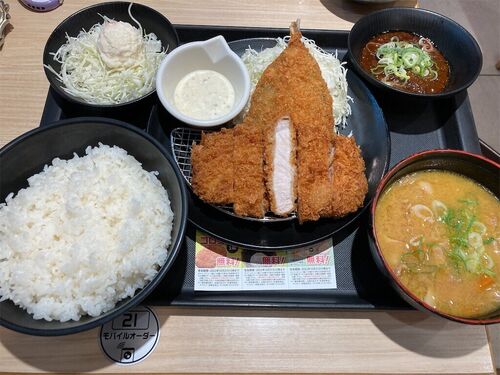上ロースかつ&アジフライ定食(ライス大盛) ¥980 豚汁 ¥180 単品黒麻婆ソース ¥130 ミニポテキャベ ¥801,370円松のや 板橋区役所前店 080-5928-0538 東京都板橋区板橋2-61-10 https://tabelog.com/tokyo/A1322/A132205/13166343/